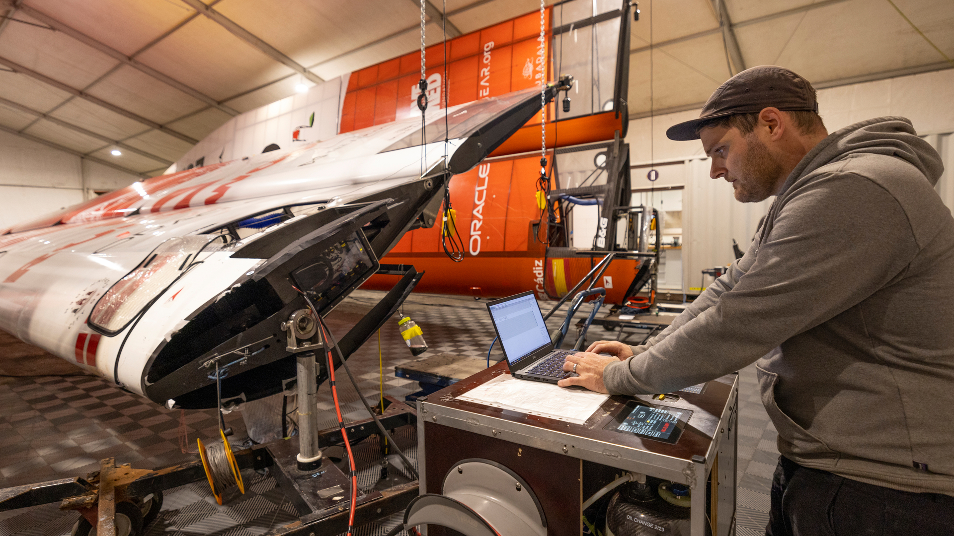Control of the wing is managed by the wing trimmer – a member of the F50 crew who is solely responsible for dynamically coaxing the wingsail into the correct shape for both the wind conditions and angle to the wind the boat is sailing.