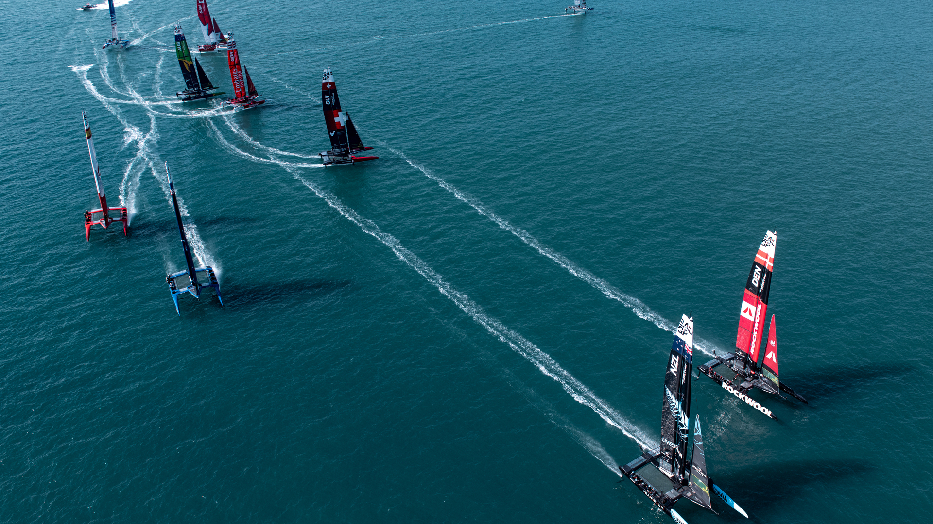 Drone image of the SailGP's F50 fleet during the 3rd race of the Cadiz SailGP event in Season 4